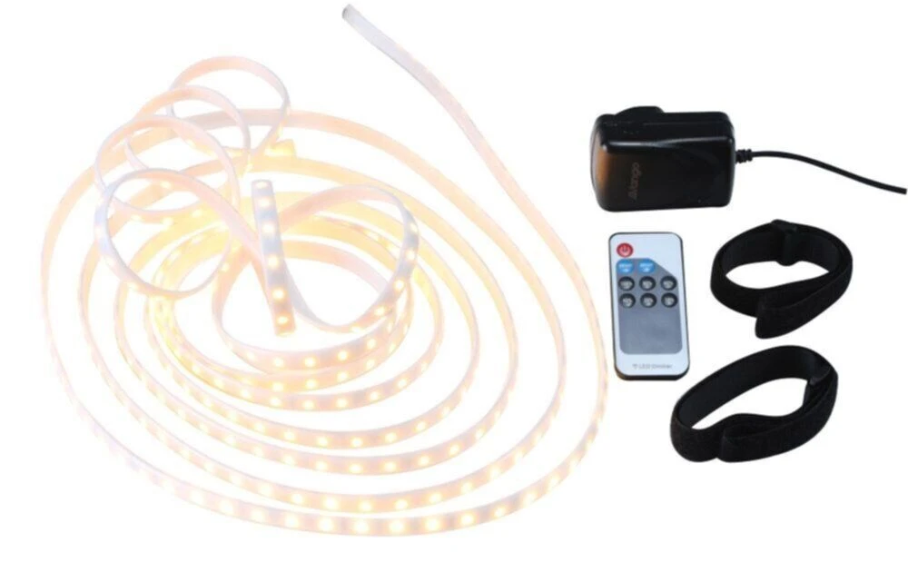 The Vango Sunbeam 6m Flexi light is a small pack-size, LED light strip, which packs a punch. As one may be able to guess, it has a 6 metre length, and will cover along a roof pole, or internal Airbeam, to maximise the light inside the tent of an evening. The light can be adjusted to dim or brighten the LEDS, and the Flexi also comes with a remote control, allowing to turn lights on and off from the comfort of your camping chair.